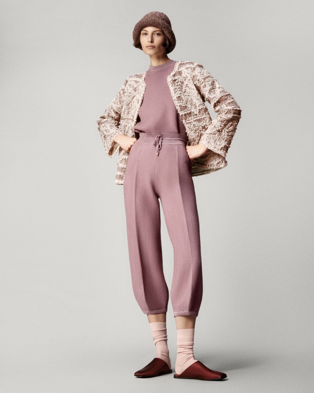 تجسّد هذه المجموعة شعورًا جديدًا بالدفء يملأ كل مكان، مع إضافة لمسة من اللمعان الليلي إلى مجموعة التعبيرات. وتتميّز الملابس الخارجية والمعاطف ذات القصات الدقيقة بالنعومة. وتستمر لمسة لورو بيانا الأنثوية، التي تم تقديمها في الموسم الماضي، في السترات الصغيرة المقترنة بتنانير بطول الركبة، وفي التنانير الطويلة، والمعاطف المحبوكة المقترنة بسراويل متطابقة. وكما هي الحال دائماً، تتناقض روح الهواء الطلق مع الشعور الأنيق بالأنوثة، ما يحدّد تناغماً مركباً. تمت إعادة اختراع سترة Traveller الميدانية الشهيرة بلون Pecan Syrup من جلد بلونجيه ونمط الحزام، وهو رمز تم اكتشافه لأول مرة كبطانة داخل سترة Horsey®، وتم تحويله إلى إطلالات كاملة. كما أضافت العلامة نسيج الأباكا المبتكر – وهو مزيج من ألياف أوراق الموز والكشمير. تتميّز التنانير المطوية والبلوزات الخفيفة بالرقة، بينما تتحول أزهار كامبو دي لينو إلى طبعات حبرية ذات سحر تصويري. تتميز قطع الحرير بالمتانة والأناقة، تمامًا كما تبرز الإلهام البحري كرابط آخر مع العالم الطبيعي.