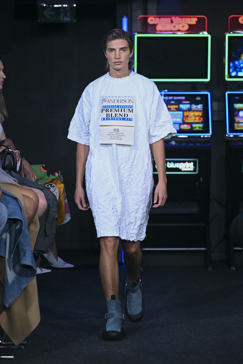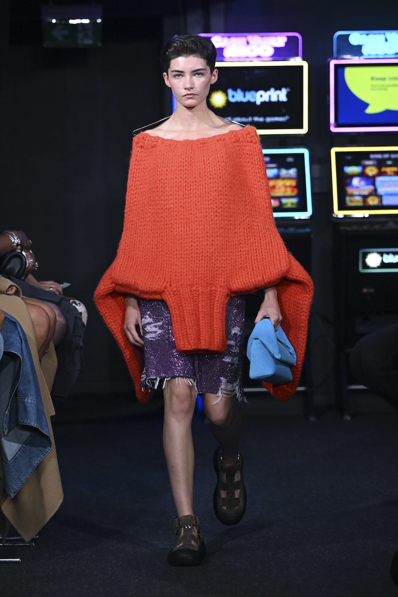 وعرض دار جاي دبليو أندرسون، إحدى أبرز الماركات المشاركة في أسبوع الموضة اللندني، تصاميم مصنوعة من الصوف الناعم، يكمّلها شعر مستعار رمادي مجعّد على رؤوس بعض العارضات في صالة الألعاب الرياضية الضخمة مركز “سيمور” الترفيهي. وسارت العارضات بفساتين مصنوعة من أقمشة شفافة تشبه الأغطية الملفوفة، أو مربوطة بحبال ستائر، تَدَلّت شرَاباتها على الصدور.