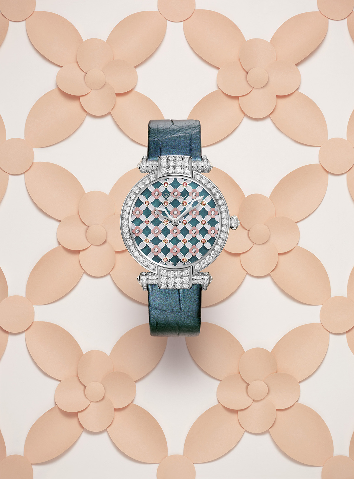 اكتسى ميناء الساعة بطلاء مينا بدرجة قوية من اللون الأزرق المخضر، تحفّه شرائح بارزة من الذهب الأبيض لتشكّل زخارف أرابيسك دقيقة مملوءة بطلاء مينا بلون أبيض. وتكمّل هذه اللوحة الفنية المبهجة ترصيعات من أحجار سافـير بادبارادشا وزهور من عرق اللؤلؤ الوردي، بينما تكتمل هذه اللمسة الحرفـية البارعة بالعقارب التي تتخذ شكل الخناجر وبسوار Imperiale المميّز المصنوع من جلد التمساح.
